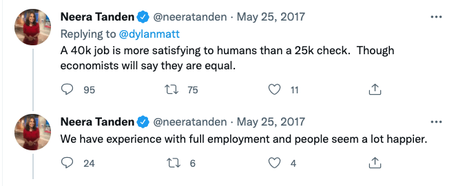 To many, the idea of giving residents free money with no strings attached or work requirements sounds radical because it would cost taxpayers too much money and encourage people to leave their jobs and stop working. Neera Tanden, former head of the left-leaning Center for American Progress and now a senior adviser to President Biden, said exactly that, tweeting her opposition to a universal basic income, or UBI, in 2017.