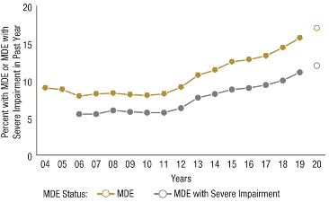 The stats on adolescents (ages 12 to 17) continue to show an increase in major depression episodes (MDE), a trend that began about a decade ago. While the 2020 data may be affected by differences in methodology (online vs face to face), they appear to be following the same trend.