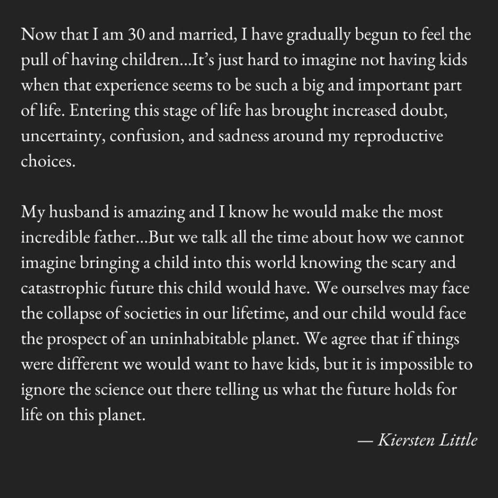 “I feel very angry…at past generations and current ones for the poor choices they have made for the health of this planet,” she wrote in a post on Conceivable Future, an organization spotlighting the impact of climate on reproductive decisions. “Angry at our selfish, capitalist society and all the greedy corporations out there that are so incredibly short sighted. I feel that I could absolutely be happy in my life without a child, but I wanted the CHOICE. I do not feel like I have a choice…I am so sad about this and do not know how to reconcile my feelings.”