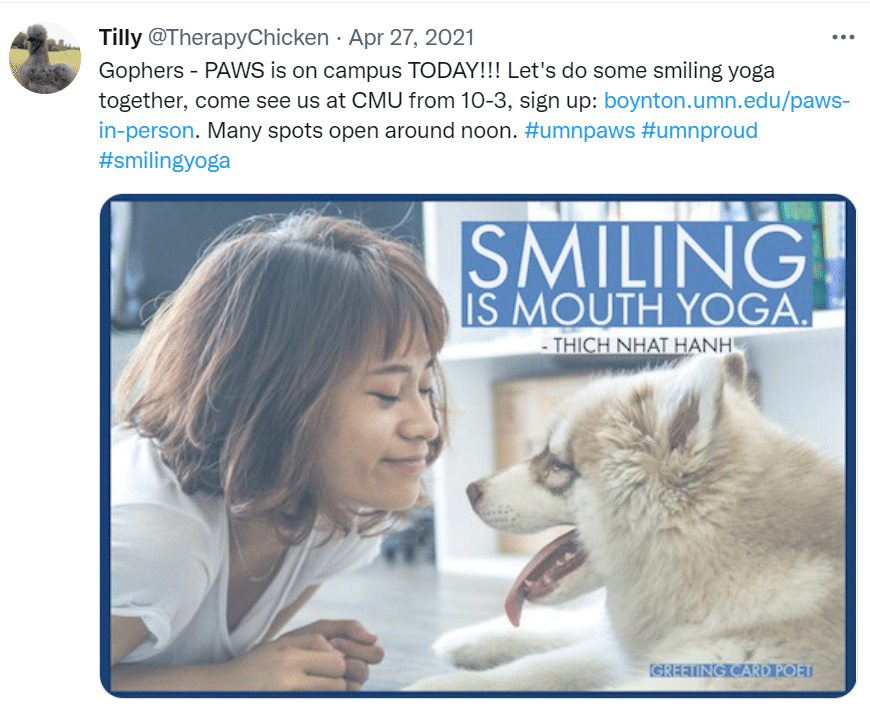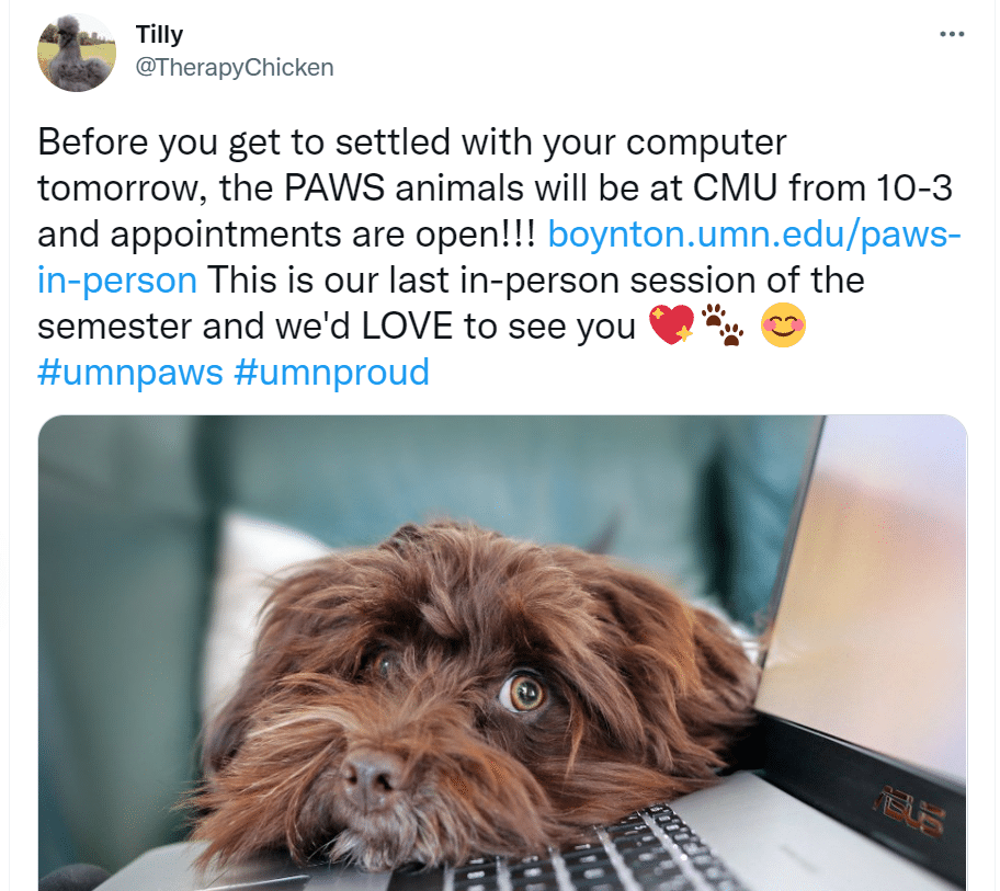 University of Minnesota students needing mental health support can find comfort in visits from pets, including bunnies, miniature horses and even chickens through the PAWS program (Pet Away Worry and Stress), reports kare11.com. “We are hardwired for connection,” said Tanya Bailey, who started the program in conjunction with Boynton Health. “That act of petting…helps to reduce that blood pressure, that heart rate.”