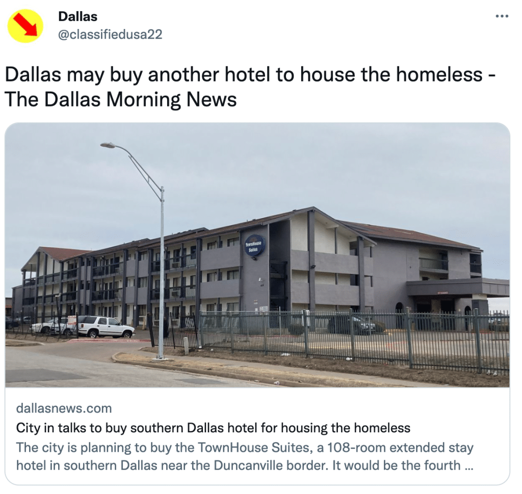 4th hotel to combat homelessness in Dallas: The current Townhouse Suites in Dallas, Texas may soon be the fourth hotel approved by the city council to be used to support people experiencing homelessness. In addition to providing transitional housing, the city is expected to partner with a local nonprofit to provide mental health, substance use, and job placement services to residents.