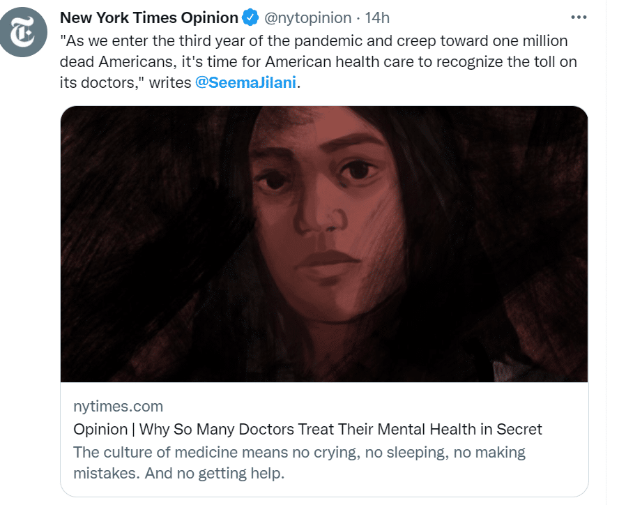Despite an expanding body of research on the need for physician mental health support, pediatrician Seema Jilani wrote a revelatory op-ed for the New York Times that describes the mental health stigma that keeps doctors from getting mental care – and often forces them to keep any help they do seek secret.