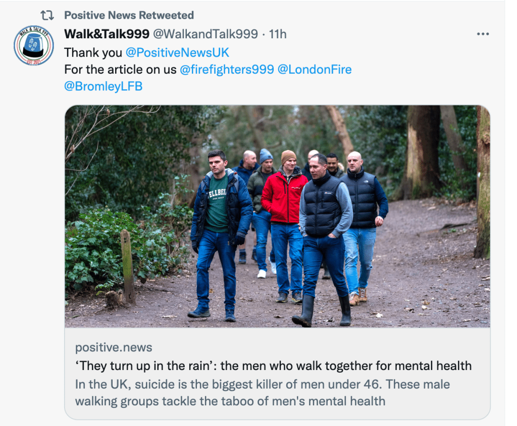 “People even turn up in torrential rain,” Corney said, an indicator of how necessary they are. “Just in our small group, we have five people who were on long-term sick leave but have now returned to work. They say that the group walk is their ‘reset’ for the week, they know they can cope with anything, because they can talk about it during the weekly walk.”