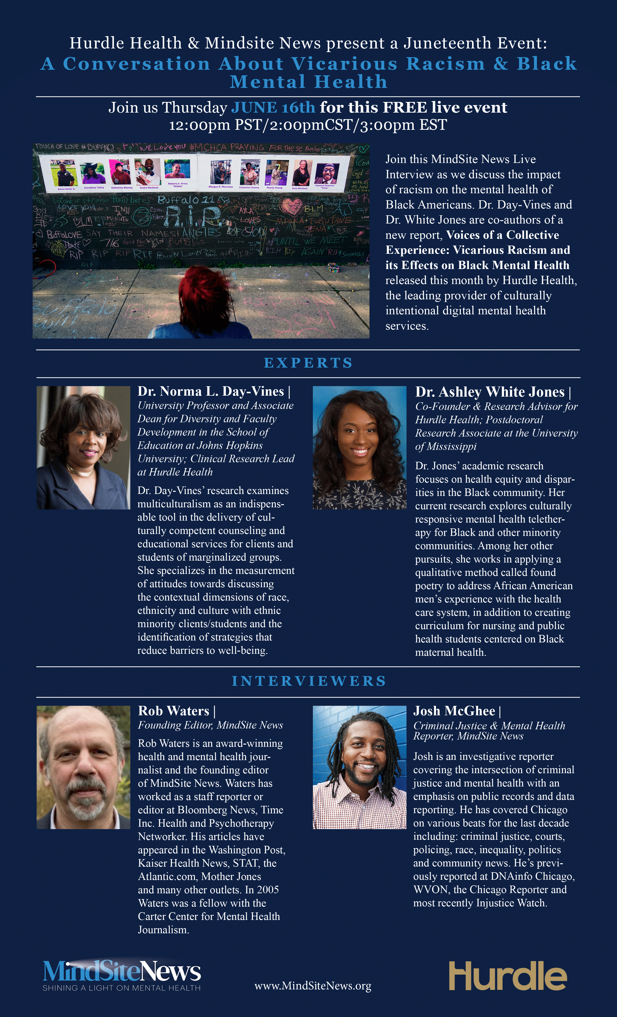 And in honor of Juneteenth, please join MindSite News for our first-ever live event this Thursday at 12 noon PT/3 pm ET when we speak with researchers from Hurdle Health about the impact of racism on Black mental health. Register at this link and get more information at the bottom of this email. Now, on with the daily news…