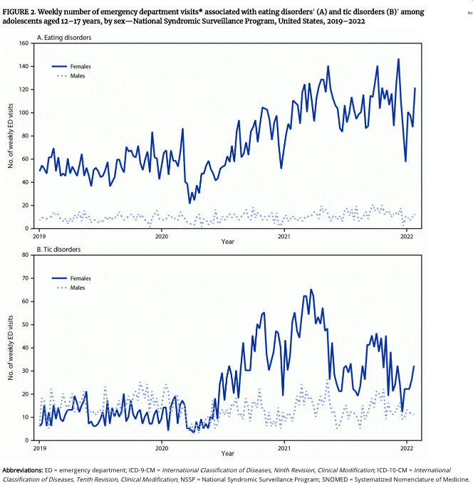 Then, during the pandemic, the gender gap of teen mental health crisis exploded. According to the CDC, weekly visits by kids to the emergency department (ED) for psychiatric conditions plummeted when the COVID-19 emergency was declared in March 2020. But over the following months the number of girls in crisis coming to the ED rebounded to pre-pandemic levels, while it remained low for boys.