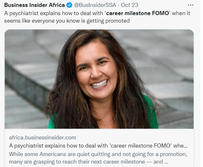 Even though “quiet quitting” seems to be more popular than before the pandemic, some young Americans are now obsessed with FOMO (fear of missing out) over promotions and raises, according to Business Insider. This trend has accelerated in recent years, says psychiatrist Anisha Patel-Dunn, chief medical officer at LifeStance Health, who says this fear of missing out can even extend to marriage, having kids and buying a house.