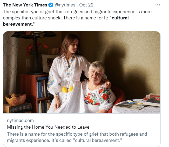 That’s how the New York Times opens its article on the grieving familiar to many immigrants who had to leave their homeland. With skill and sensitivity, the reporter explores the feelings of Ukrainian refugees and others forced to flee their countries. “Feeling uprooted is something many immigrants are familiar with, split between the here and the back there, between the push to assimilate and the pull to preserve parts of themselves and their culture,” writes Alish Haridasani Gupta. “And it is often the intangibles from home — the smells and sounds, the metaphors and jokes in a native tongue that can’t be translated, and cherished rituals — that they long for.”