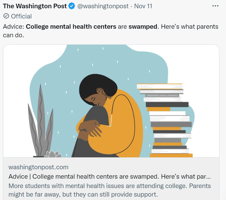 The Post outlines a number of strategies for parents, including asking their kids if they could sign papers waiving confidentiality so the school could notify them if there’s a problem, setting up continuous care if needed before the student arrives on campus, and helping them sign them up for telehealth counseling if no counselors are available. Most of all, let your child know they can talk to you about anything – even if it’s that they are failing their classes or need to take time off from school.