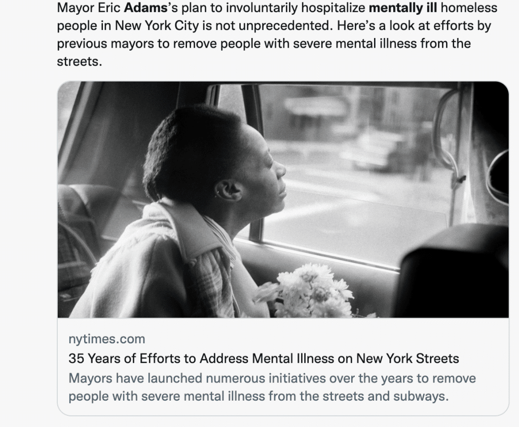 The mayor of New York is pushing a plan to involuntarily remove homeless residents with severe mental illness from the streets and get them in treatment, the latest in decades of largely failed attempts. In California, where the governor will try his own controversial plan, Los Angeles is transforming a mothballed hospital into a sprawling campus with affordable housing and mental health services. The 988 crisis hotline went down for a day and no one said why. And a compulsive liar – truthfully it seem – blames his fibbing on mental illness. All this and a whole lot more in today’s newsletter.
