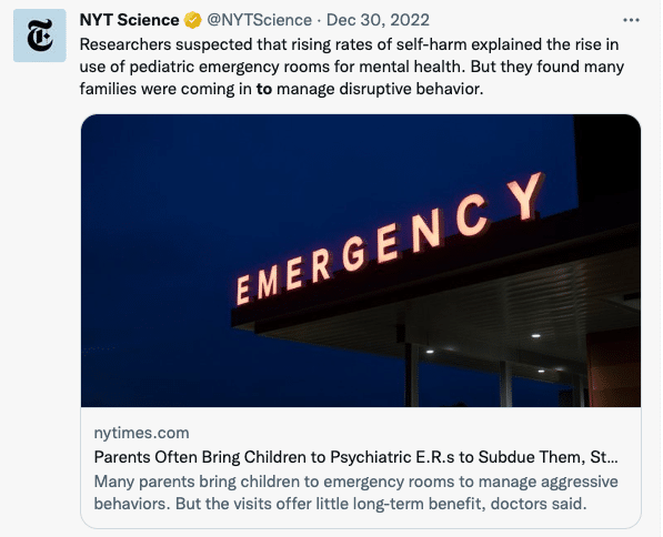 The adolescents most likely to come back were not patients who harmed themselves, the New York Times reported. Instead they were kids whose agitation and aggressive behavior were too much for their parents and caregivers to handle. Many had previously received sedatives or other drugs to restrain them when their behavior became disruptive. The data point to the futility of trying to handle mental health problems at an ER, clinicians say.
