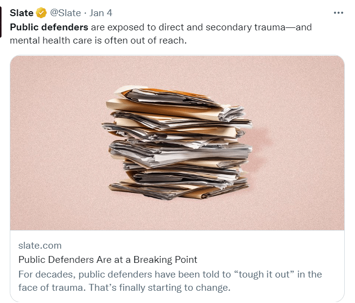 But public defenders who need mental health support often face significant challenges. How could you defend that person? is an oft-posed (and maddening) question from therapists unfamiliar with public defense work, according to Slate. Even with the most understanding mental health provider, the article notes, other public defenders may “self-limit” what they disclose about work stressors, out of an abundance of concern for confidentiality. And according to Andrews, the work hours are so awful that many public defenders may not be able to find the time for a therapy appointment – or even a visit to the dentist.
