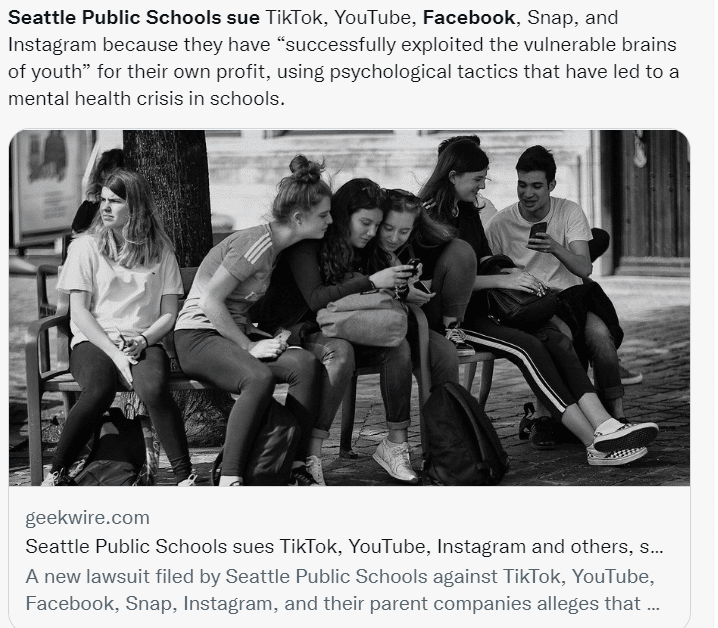 Seattle schools have filed a lawsuit against the tech companies running TikTok, Instagram, Facebook, YouTube, and Snapchat, arguing that they’ve “created a public nuisance by targeting their products to children” and need to be held accountable for the youth mental health crisis, the Associated Press reports. The tech companies have hooked tens of millions of students on “excessive use and abuse” of the social media platforms, according to the complaint, including content that is “harmful and exploitive…such as pro-anorexia and eating disorder content.”