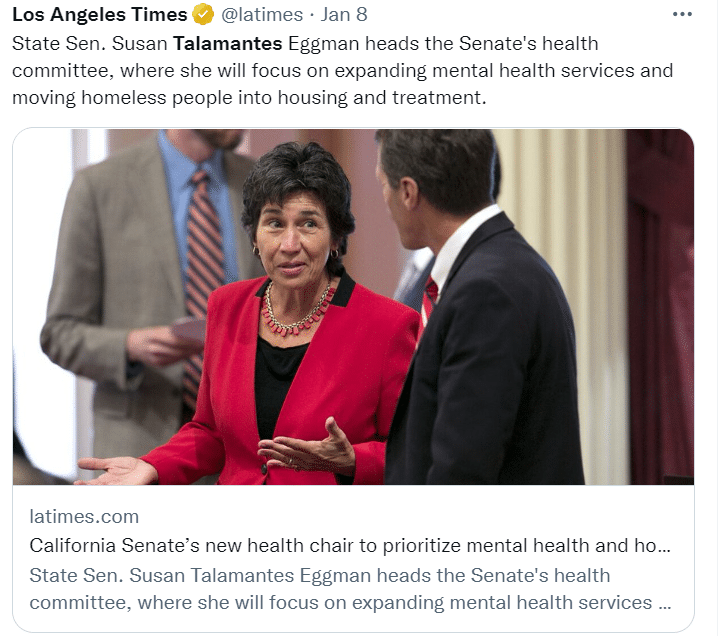 “We see real examples of people dying every single day, and they’re dying with their rights on. I think we need to step back a little bit and look at the larger public health issue,” Eggman said of the bill prior to her appointment. “It’s a danger for everybody to be living around needles or have people burrowing under freeways.”