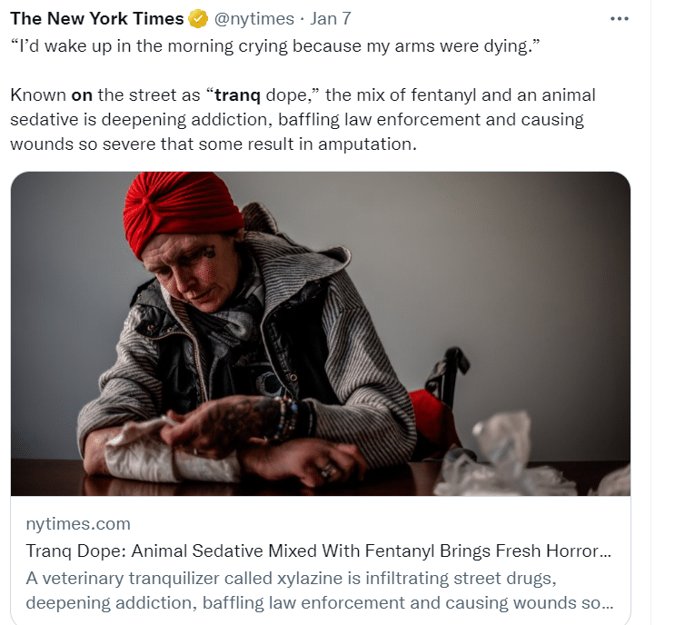 If the threat of a fentanyl overdose wasn’t enough, users of street drugs now have an alarming new threat. “The tranq dope literally eats your flesh,” Philadelphia-based tattoo artist Brooke Peder told the New York Times. Xylazine, a veterinary anesthetic, has infiltrated Philly’s drug supply and was found in more than 90% of the city’s lab-tested street fentanyl in 2021. The drug was also found in the street-drug supply of 36 states and the District of Columbia, according to an October study