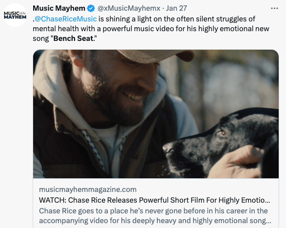 Country singer-songwriter Chase Rice says his latest song, “Bench Seat,” is “the darkest but most real thing I’ve ever done.” The accompanying music video – which Music Mayhem Magazine says is worthy of Music Video of the Year – explores mental health struggles through the story of Rice’s college buddy, who nearly took his own life.