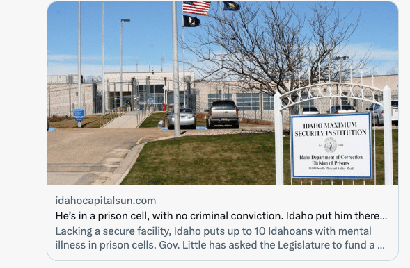 Ben is a 30-something Idahoan with schizoaffective disorder. Diagnosed almost 20 years ago, he usually lives with his mother Diane. But now he’s being held in the Idaho Maximum Security Institution, a prison surrounded by a double-perimeter fence with razor wire and alarms – despite not being charged with a crime, the Idaho Capital Sun reports. Nine cells in the prison are used for “dangerously mentally ill” men who typically are held for four to six months – though they haven’t been convicted of crimes.