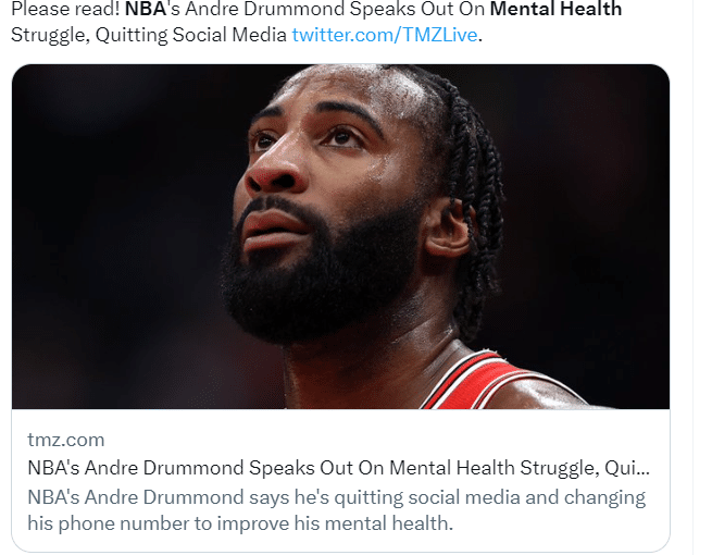 The NBA’s Andre Drummond is quitting social media to help protect his mental health, according to TMZ. The Chicago Bulls center said he is turning off all his apps and letting his managers take over his social media accounts, as well as changing his phone number. To his 840,000 Twitter followers, he wrote: “Time to focus on my mental health. If you too are struggling with your mental health, you are not alone it’s okay to ask for help.”