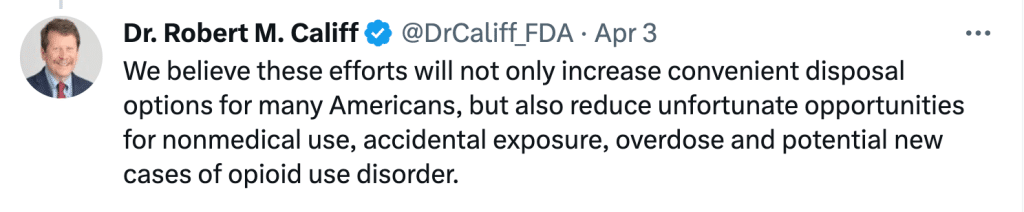 The FDA will require opioid manufacturers to include mail-back envelopes so patients can dispose of unused pills. The effort will likely start next year, Politico’s Prescription Pulse newsletter reports. Here’s FDA head Robert Califf: