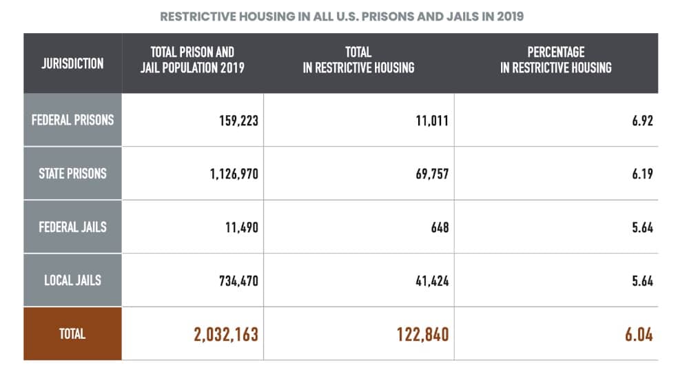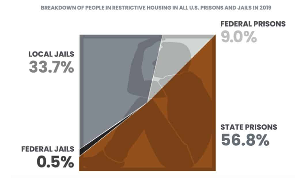 According to thereport, federal and state prisons reported locking up roughly 6.3% of all people in prison in solitary confinement. Meanwhile, local jails and federal pretrial detention facilities had more than 42,000 people – or 5.6 percent of the national jail population – in solitary confinement, according to numbers from mid-2019.