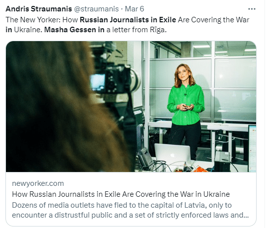 Widespread distrust is taking a toll on the mental health of Russian journalists in exile. Earlier this year, New Yorker writer Masha Gessen wrote a devastating piece in which they examined Russian reporters who had escaped to Latvia, one of the few nearby countries who welcomed them in. Forced to flee Russia after the Kremlin took control of the media after the invasion of Ukraine, they faced widespread anger and suspicion even though they oppose Russia’s war on Ukraine. Said Sabine Sile, the former head of the media-studies department at the Stockholm School of Economics in Riga, Latvia, who had opened a co-working space for Russian journalists, “I propose we see each other as humans. We have common values, and they are the only things that will make it possible for us to survive this war.” However, an earlier on-air mistake resulted in many of the Russian journalists again having to move, this time to the Netherlands.