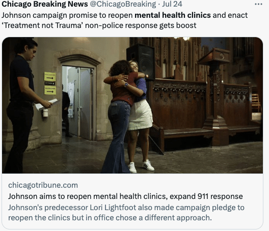 Chicago’s new Mayor Brandon Johnson campaigned, in part, on a platform to reopen shuttered mental health clinics and increase non-police response to mental health crises. On Monday, his administration took its first step to deliver on the promise when officials and the “Treatment Not Trauma” coalition urged a committee of the City Council to pass a non-binding resolution calling for the reopening of mental health centers and the expansion of mental health staff and of mobile crisis response and prevention teams, according to the Chicago Tribune.
