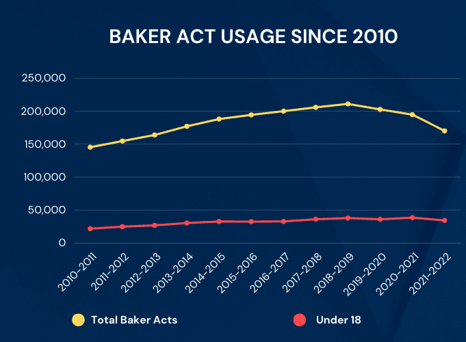 After years of steady increase, the number of Baker Act holds reached a peak in 2019–20 when Florida residents were subjected to more than 200,000 mental health holds – and then declined for the first time as the Covid pandemic began.