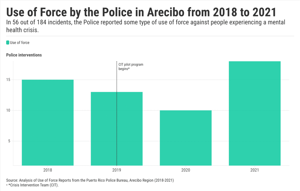 For this investigation, CPI analyzed use-of-force reports from the Arecibo Region between 2018 – before the CIT pilot program – through 2021, when it had officially ended, but, according to Negrón Meléndez, remained in operation. Of the 185 incidents in which the Arecibo Police reported using some type of force during those four years, 56, or 30%, were against people who were experiencing a mental health crisis.