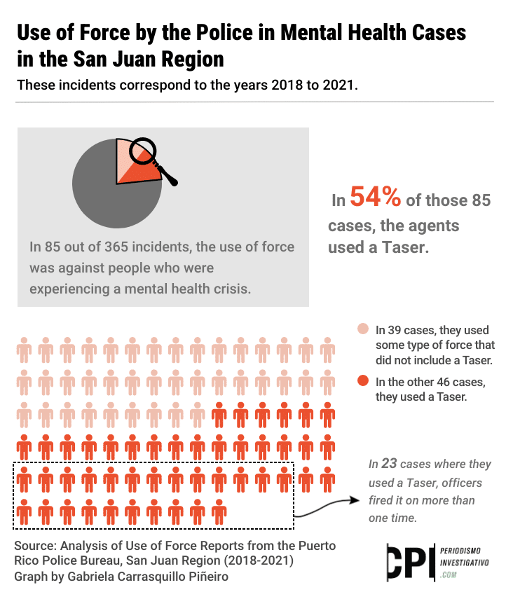 When police use force in the San Juan and Arecibo regions of Puerto Rico, about a quarter of the time they use it against people suffering a mental health crisis, according to an analysis by the Center for Investigative Journalism. In more than half of these cases, officers discharged their Tasers, which can cause serious harm.