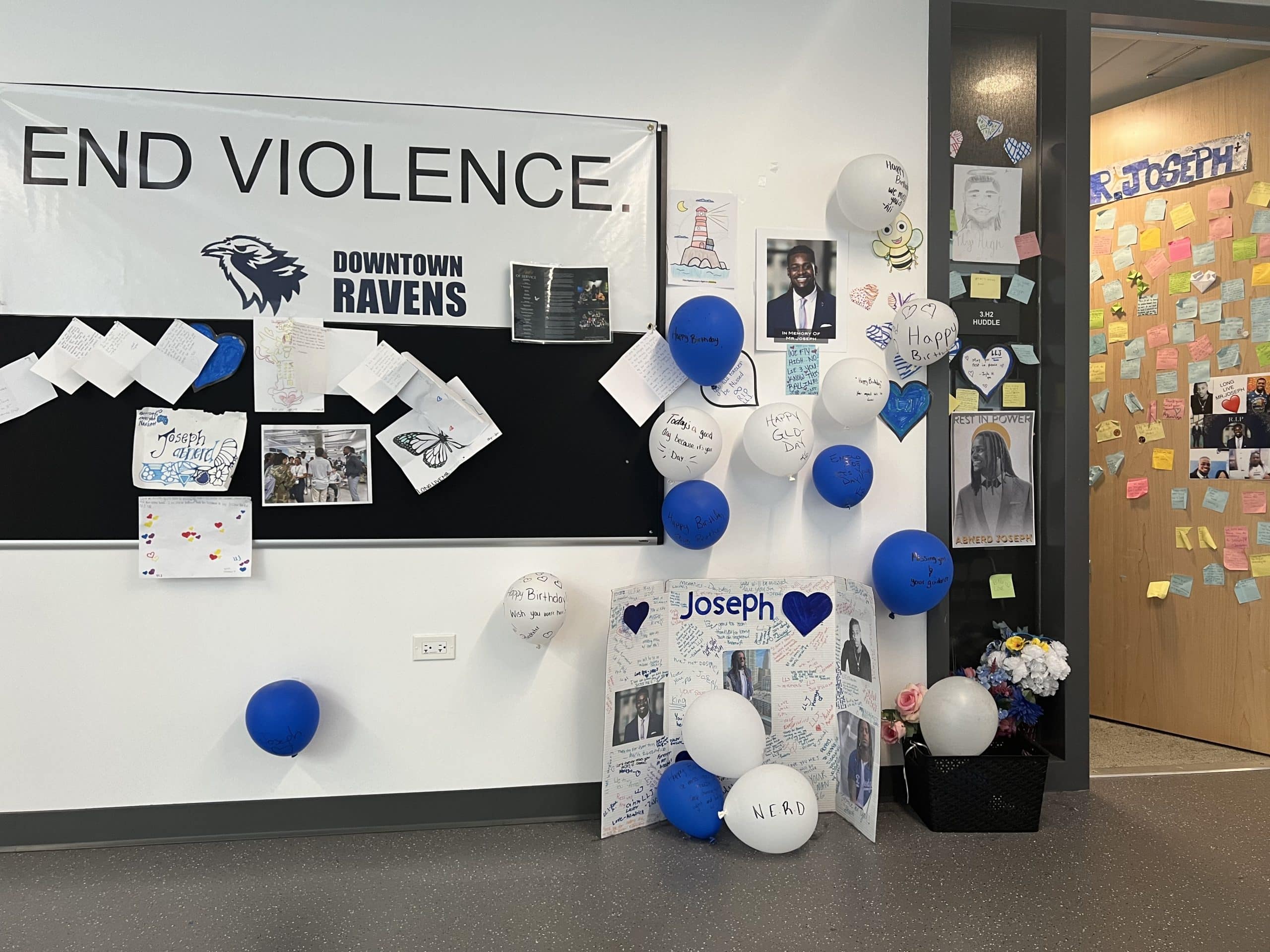 Away from the bright colors, at the other end of the hallway sits another memorial. Just outside his door sit more than a dozen balloons and a poster board wishing Mr. Joseph a happy birthday. Between the balloons his giant smile peaks out in picture after picture, even the ones hand drawn by students.