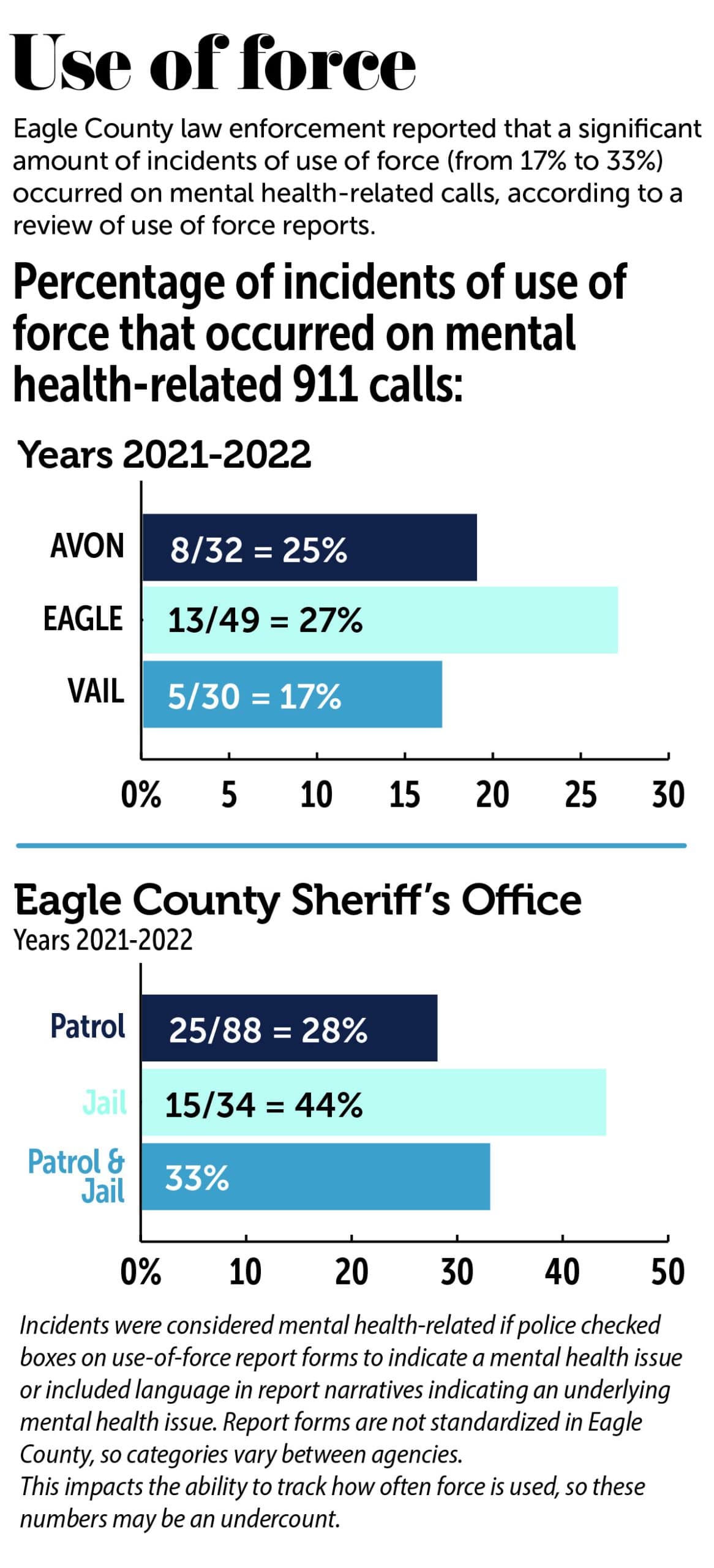 Across Eagle Valley, mental health-related calls comprised up to a third of all use-of-force cases, according to an analysis of use-of-force reports from the valley’s three main police departments and the Eagle County Sheriff’s Office.