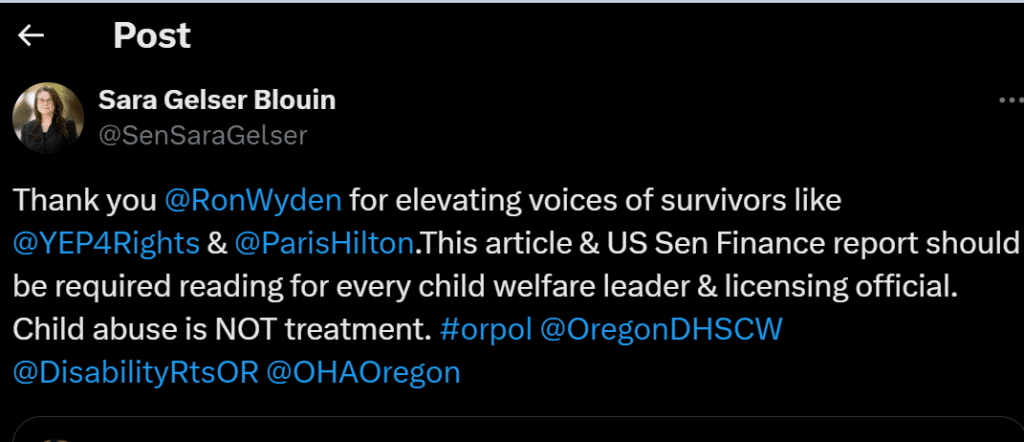 Shortly after we published our series, author Art Levine forwarded us a response to his tweet about it from Senator Sara Gelser (D-Oregon), a consistent champion of children in care. She wrote that our MindSite News article “should be required reading for every child welfare leader & licensing official.”