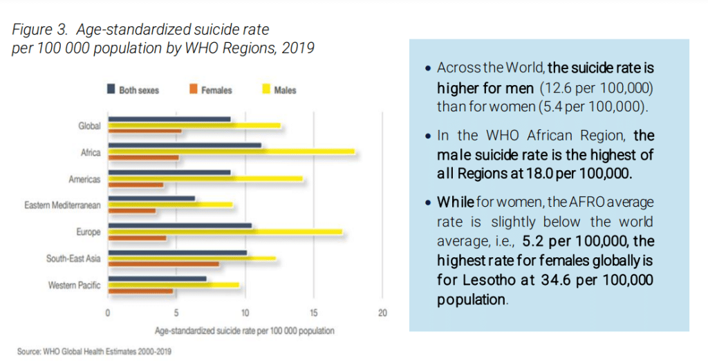Africa has the highest suicide rate of any global region, according to a World Health Organization fact sheet titled Suicide in Africa, a neglected reality – 11.2 per 100,000 population, in 2019, likely a significant underestimate, compared with a global average of 9.0. (The U.S. suicide rate was 14.5 per 100,00 in 2019, according to the WHO.) More than 75% of suicide deaths on the continent were in low- and middle-income countries. Lesotho, Eswatini, Zimbabwe, South Africa, Mozambique, Central African Republic, Botswana, Eritrea, Cameroon, and Ivory Coast had among the highest suicide rates in the world, topping out with Lesotho’s 87.5 per 100,000.