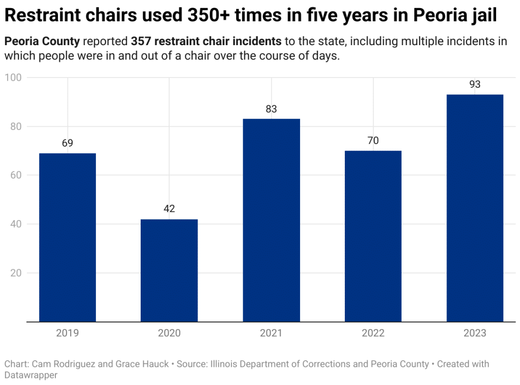 In Peoria County, an Illinois Answers analysis found that, from 2019 to 2023, jail staff indicated evidence of a mental health issue in at least 70% of the 357 known restraint chair incidents.