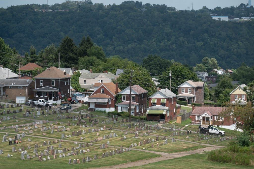 The brick homes of West Mifflin, Pa., are layered between St. Joseph’s Cemetery and the rolling hills of the Monongahela Valley. Photo: Stephanie Strasburg/PublicSource