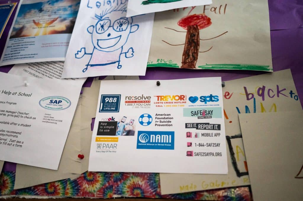 A flyer with mental health resources and crisis hotlines hangs on a bulletin board in the classroom of art teacher Lauren Rowe, faculty advisor for the SAVE Promise Club at West Mifflin Area High School. The club seeks to connect students with support and empower them to build a community of support with their fellow classmates. Photo: Stephanie Strasburg/PublicSource