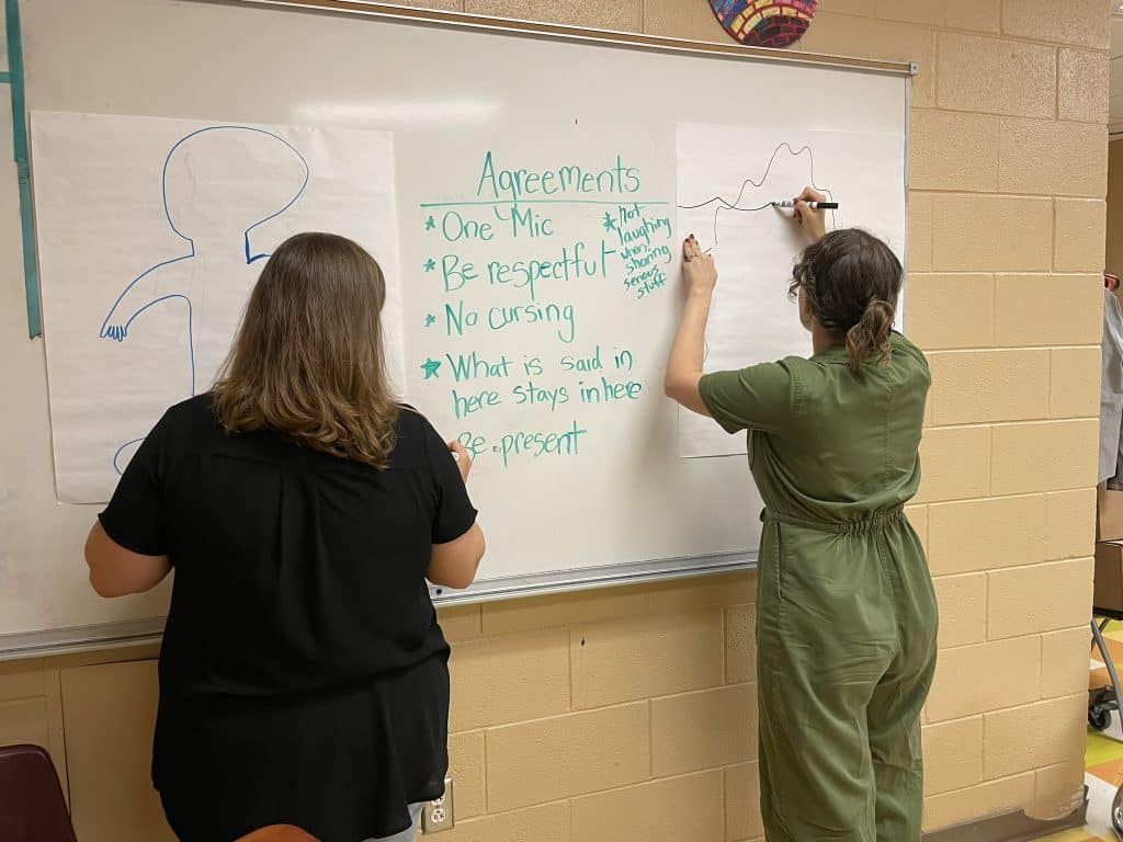 On a blustery fall day, when gusts blew the rain sideways into tiny wet daggers, two licensed clinical social workers prepared a classroom at the Juvenile Justice Intervention Center in New Orleans with tools to help incarcerated teens give voice to their feelings. Mary Chastain-Alford drew an outline of a body so the group could talk about the physicality of feelings: a broken heart, a tight fist, butterflies in the stomach.