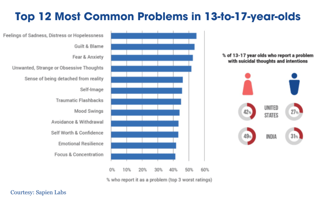 The report found worsening problems at younger ages: 13-to-17-year-olds fared worse than those 18 to 24, who in turn were more troubled than people 25 to 34. Even among the young teens, 13-year-olds fared worse than 14-year-olds, who fared worse than 15-year-olds. Difficulties were particularly pronounced in girls: 65% were distressed or struggling in a way that “substantially impaired their ability to function effectively…and would be of clinical concern.” It found that 42% of adolescent girls in the U.S. cited suicidal thoughts and intentions among their worst problems, compared to 27% of boys.