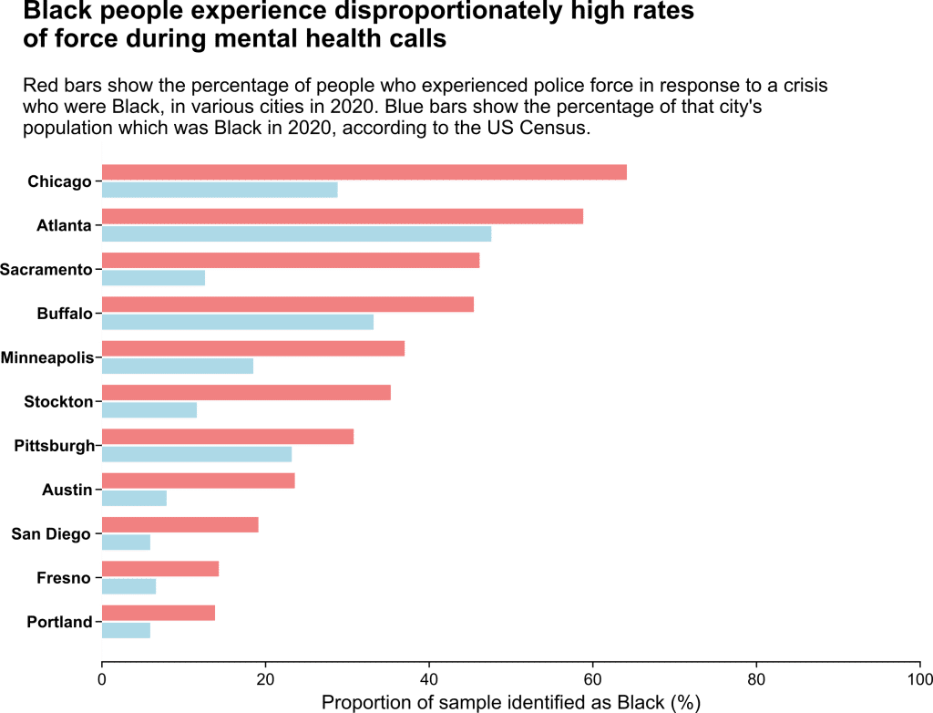 •In Chicago, Black people comprise 27% of the population but experienced two-thirds of the use-of-force incidents that occurred pursuant to a mental health-related 911 call from August 2020 through August 2024.