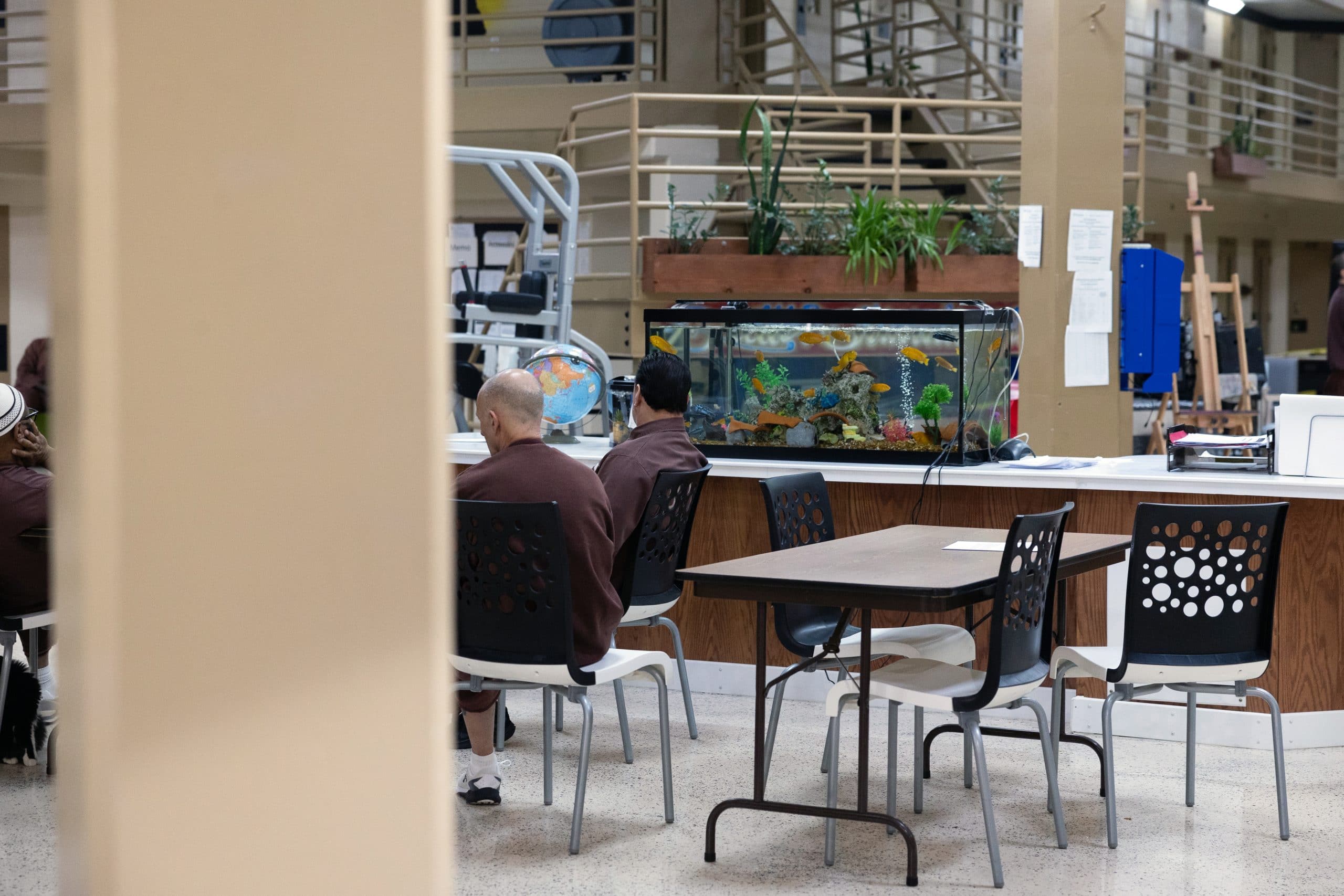 Inside the imposing beige walls of the Pennsylvania state correctional institution in Chester, a suburb of Philadelphia, there is a fish tank whose inhabitants are part of something bigger than themselves. There are nearly two dozen of them – African cichlids, tetras, and a lone angelfish – swimming among artificial coral and rock formations. Tiny bubbles rise from the helmet of a plastic scuba diver through the crystal-clear water.