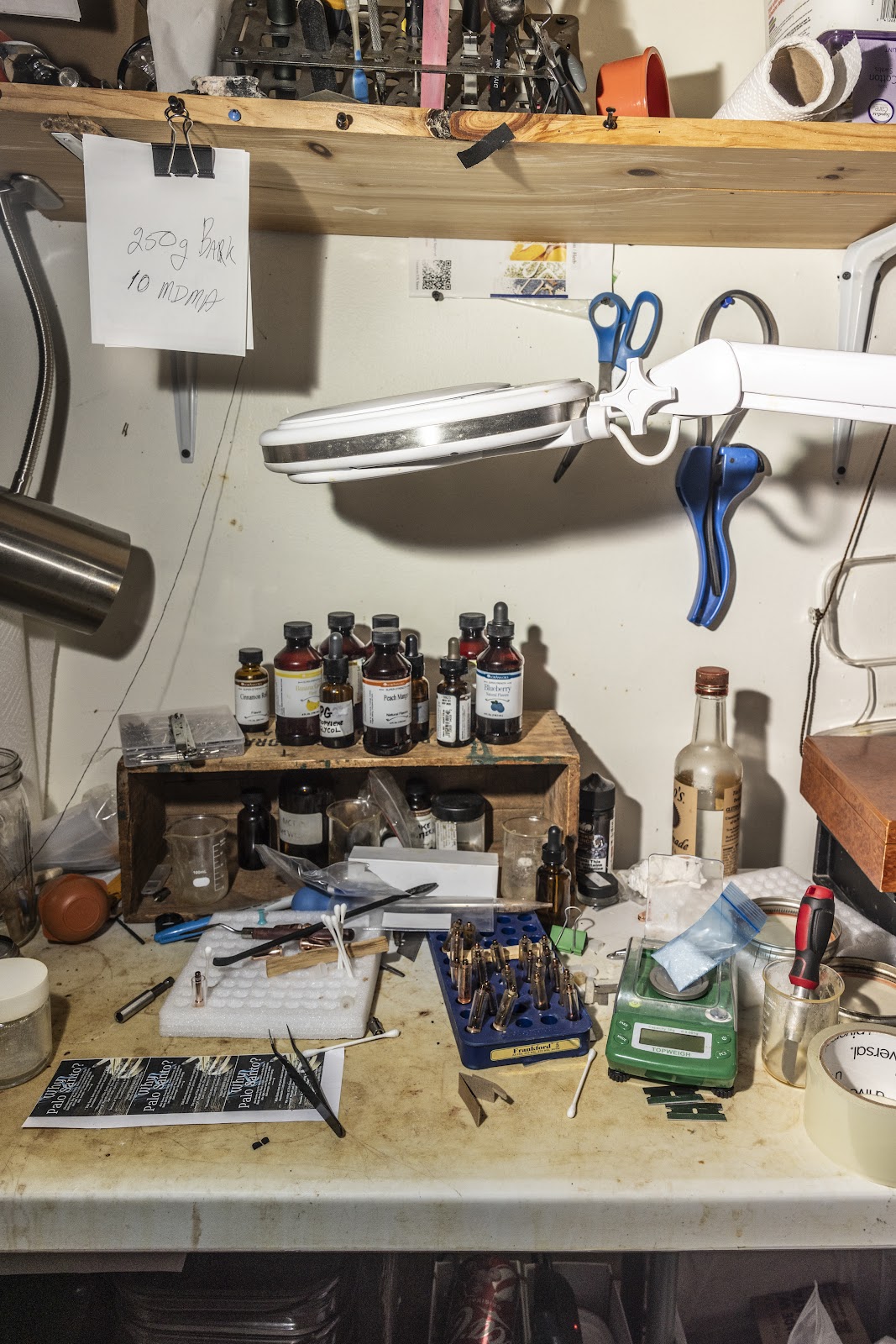 As part of a multistep process, Eric Petersen relies on a liquid solution to extract DMT from Mimosa hostilis root bark. Above: Petersen’s workbench. (Photos by Greta Rybus for The War Horse)