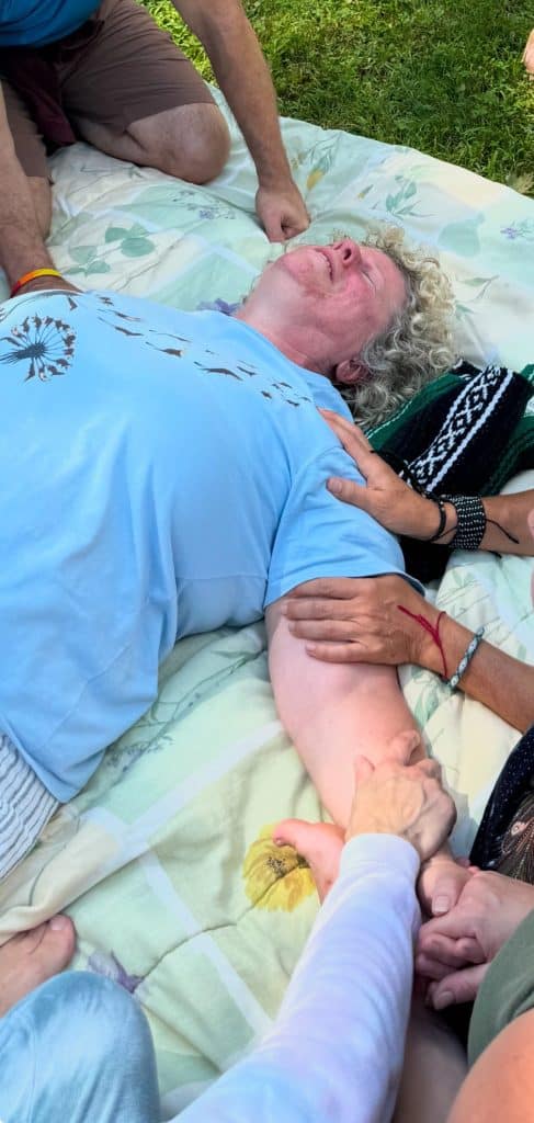 Cecelia Corey endures an ayahuasca trip in rural Maine this past summer. Fellow participants support her through the experience. (Photo courtesy of Cecelia Corey)