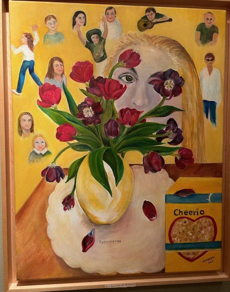 Unlike Dad’s unexpected suicide, Mom had outlined her death to me, my two younger brothers, and a younger sister two years earlier at a restaurant on New York’s Upper West Side. She would dress nicely, take the pills she had sequestered somewhere in her apartment, and then get into bed where she would be elegantly found by one of her children within a few hours. I was the least supportive of her wishes. I told her that I did not believe anyone who was capable of thinking and imagining should take their own life except to save someone else. I tried numerous approaches – quoting Maimonides, asking her to paint more, exploring her memories. We all told her we loved her; reminded her of close friends who were still alive; and tried, unsuccessfully, to engage her with the internet. She was stubborn in her views, and at some point we all gave up or thought that she would never really do it. She used the next year or so to finish her last oil painting; a self-portrait with cameos of her four children and seven grandchildren, wilting flowers, a box of Cheerios, and the word “ephemera.” She said that the cereal box was her way of saying “cheerio” as a “goodbye.”