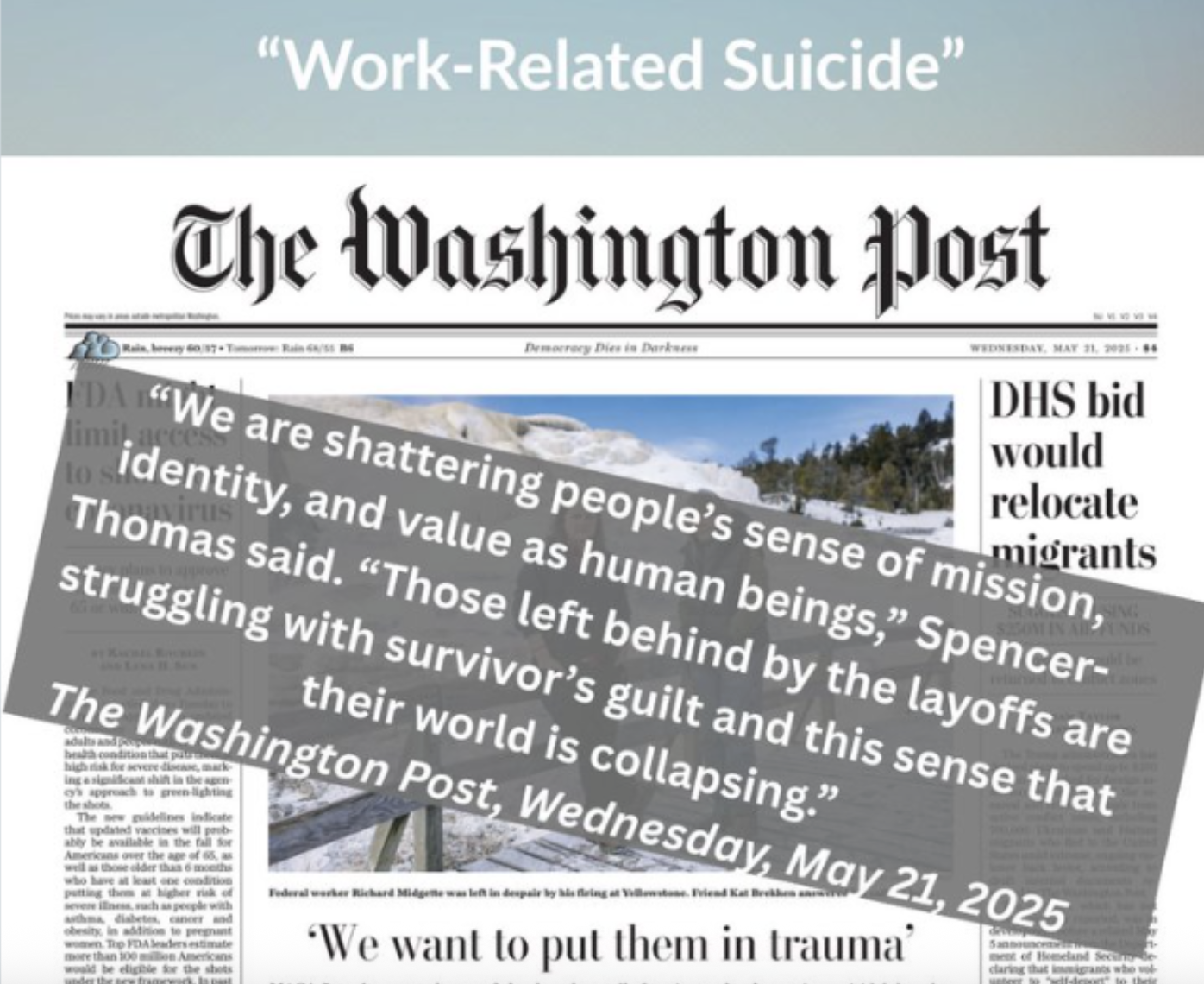 Two years ago, Project 2025 co-author Russell Vought described his vision for federal workers’ lives. “We want the bureaucrats to be traumatically affected. When they wake up in the morning, we want them to not want to go to work because they are increasingly viewed as the villains. We want to put them in trauma.” Vought now directs the nation’s Office of Management and Budget, and The White House is implementing that plan with chilling effectiveness. Federal employees aren’t just dreading going to work – some have already lost their lives from the stress.