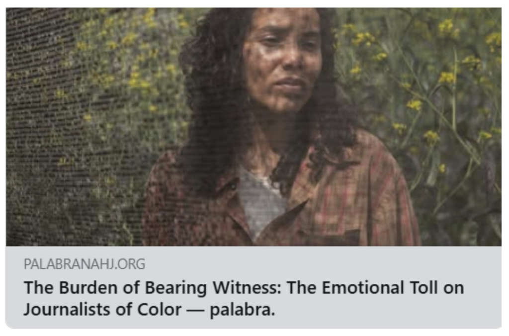 Palabra, an initiative of the National Association of Hispanic Journalists, reported earlier this year on “The Burden of Bearing Witness,” or what’s at stake for journalists, particularly immigrants and journalists of color, in doing this work. It wasn’t until the pandemic that newsrooms began to acknowledge the emotional and mental impact reporters experience, being required to run toward trauma.