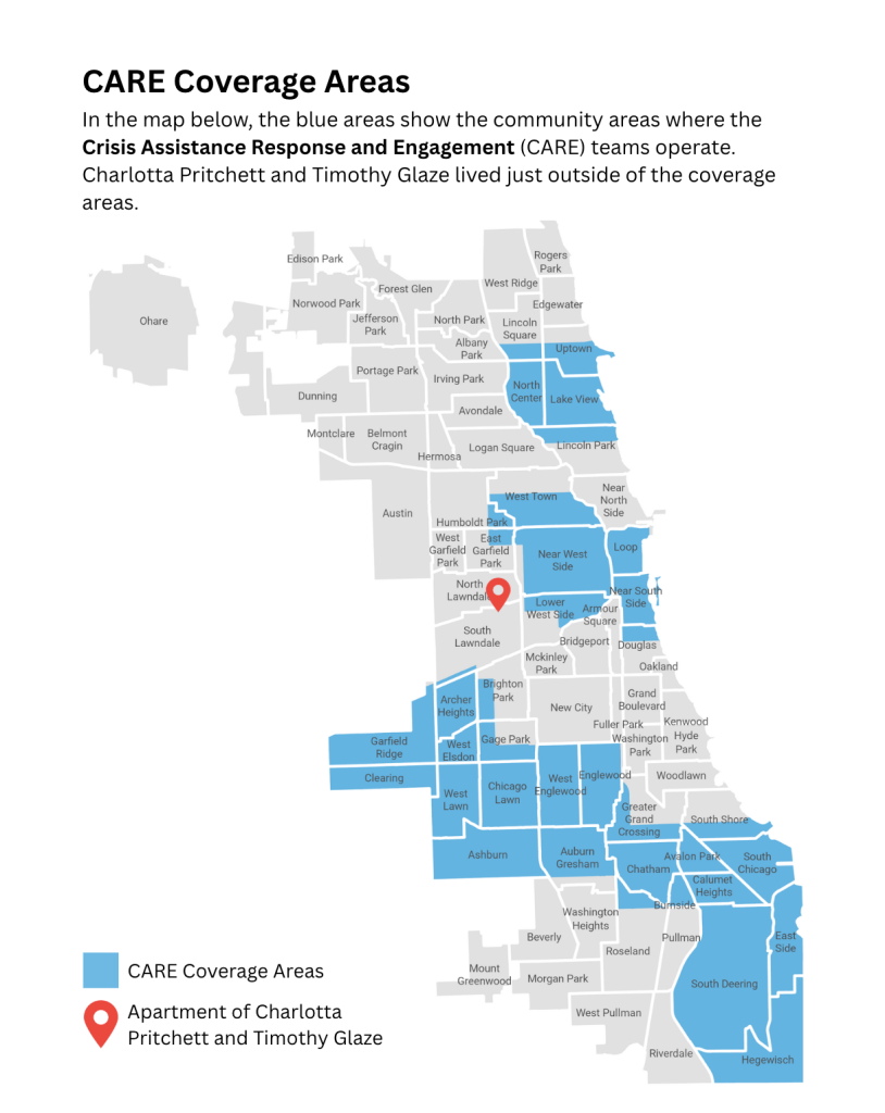 Pritchett’s apartment in Little Village fell outside of CARE coverage areas and her multiple 2am calls to 911 came after CARE’s 10:30am–4pm day had ended. Plus, Pritchett had never heard of CARE and didn’t request a mental health response.