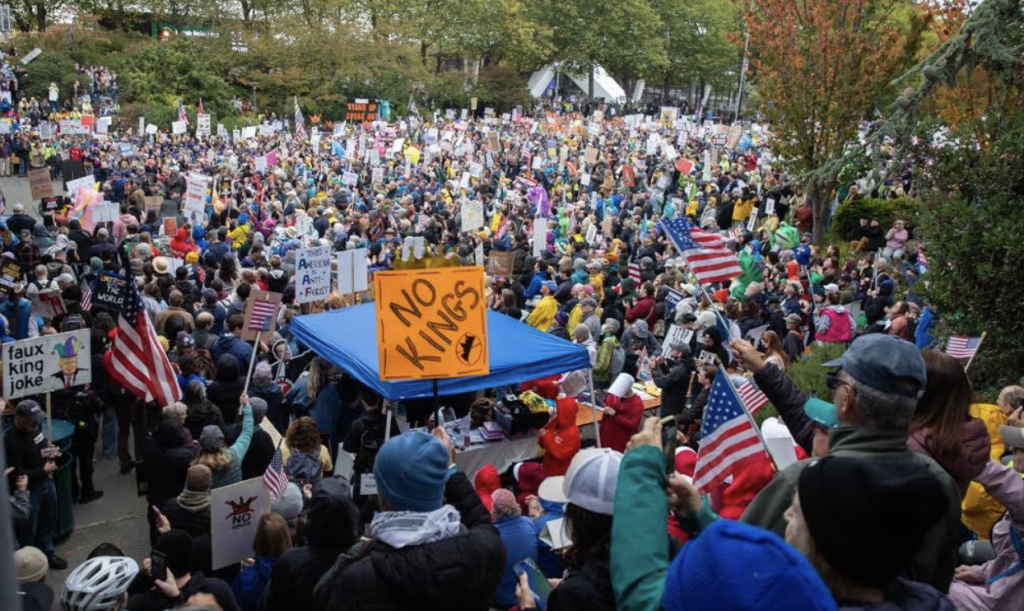 Seattle, WA (above) had a turnout of 90,000 people. Photo: Michael Moore’s Substack, which features photos of October 18 No Kings Day sent to him from readers around the country and the world.