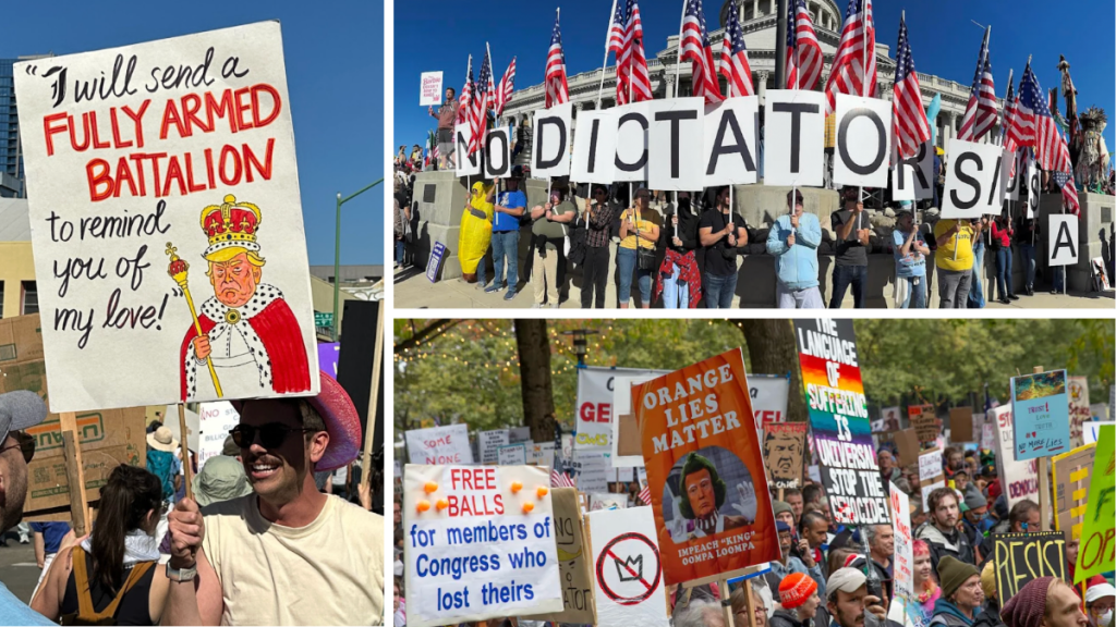 Clockwise from left: Sign at a #NoKings rally in Oakland, CA. Photo: Rob Waters; photos submitted by readers to Michael Moore and published on his Substack from Boone, North Carolina and  Salt Lake City, Utah.