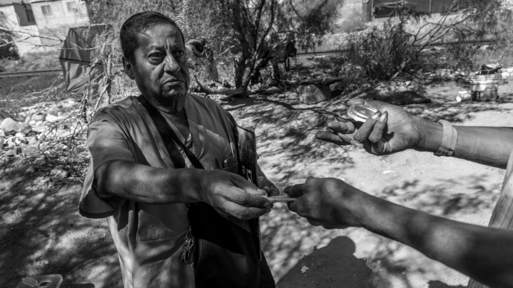As the healthcare workers approach the small collection of makeshift shelters along the train tracks that cut through the northern Mexico industrial hub of Ciudad Juárez, the people who gather in this place to use drugs prepare for their arrival.