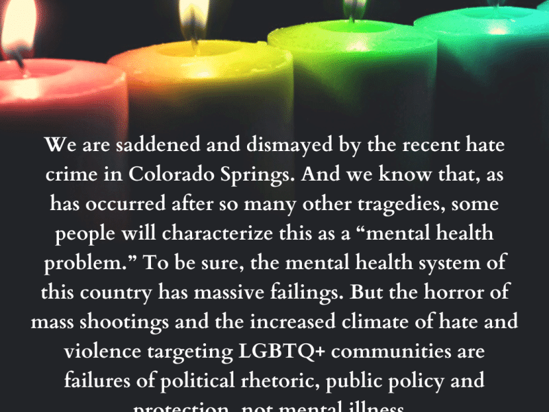 We want to express our sadness and dismay with the vicious hate crime that took place last weekend in Colorado Springs – and to say something about the hollow, default expression that occurs after every such act of mass murder.